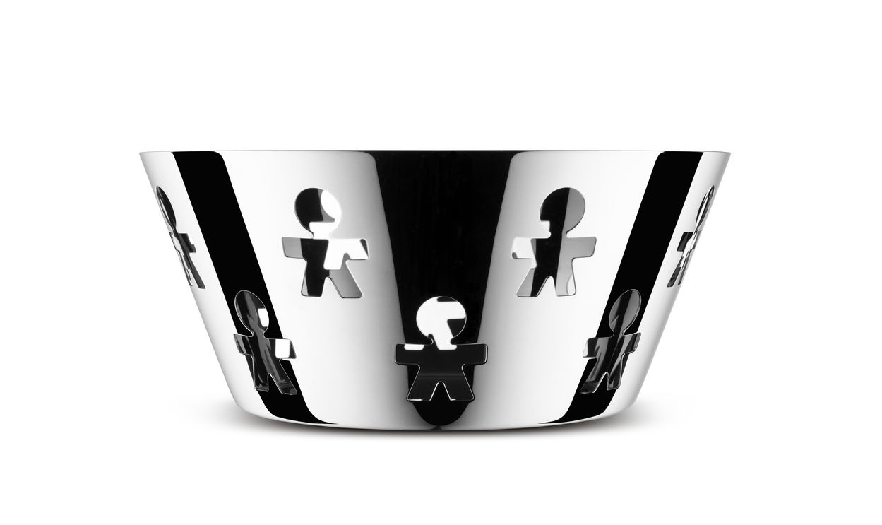 De klassieker onder de design: Girotondo met de King Kong uitgesneden poppetjes. Inox schaal met een doorsnede van 20,5 cm cm en 8,8 cm hoog.