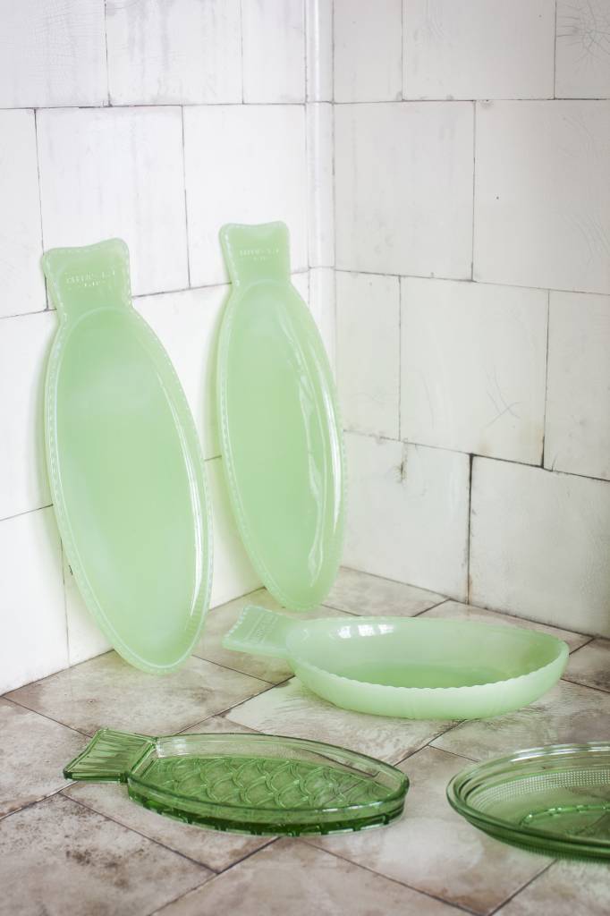 Een originele collectie groen glas van de Italiaanse designer Paola Navone. Hij presenteert hier de serviescollectie Fish & Fish. Hierbij liet ze zich inspireren door producten vervaardigd in de Verenigde Staten tijdens de Grote Depressie van de jaren 30. Toegankelijk, solide en weloverwogen vindt deze collectie haar weg naar alle mogelijke tafels. De schalen, bokalen en flessen zijn gemaakt van geperst glas en beschikbaar in Jadeite (groen), Milk Glass (wit) en Depression Glass (transparent). Deze toegankelijke en solide serviescollectie uit geperst glas sluit perfect aan bij aperitieven, degusteren en dineren in het ‘finger food’ concept.